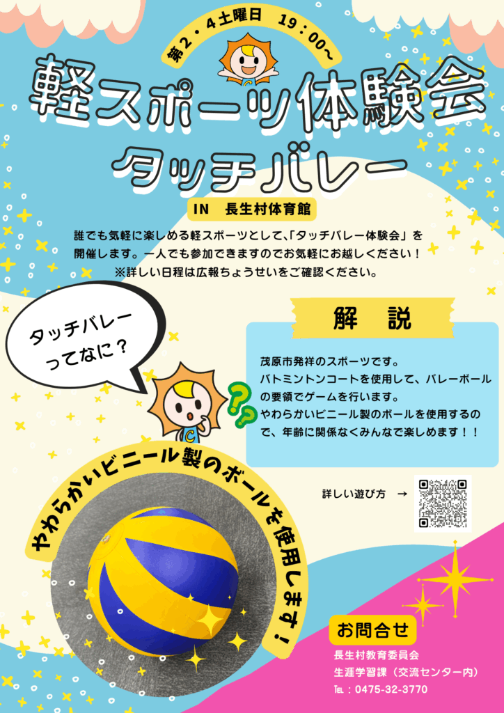 長生村では、誰でも気軽に楽しめる軽スポーツとして「タッチバレーボール」と「さいかつぼーる」の体験会を以下のとおり開催します。